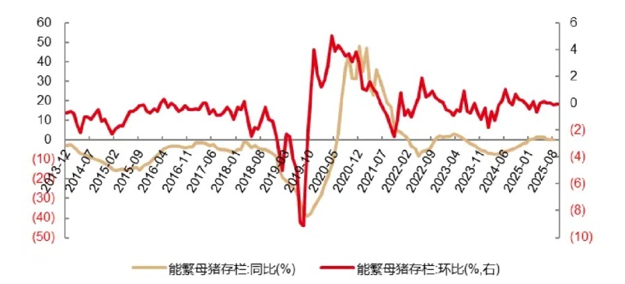 值得关注的是,在行业亏损扩大、政策驱动产能调减背景下,9月产能出现一定程度下滑。根据国家统计局最新发布的数据,9月能繁母猪存栏4035万头,同比减少28万头,下降0.7%,环比减少9万头,略降0.2%。