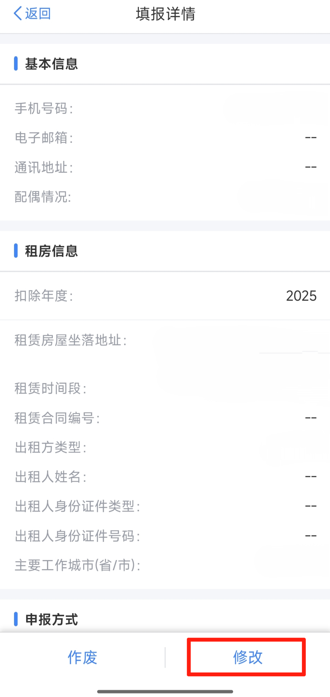 3.依次点击 “修改申报方式”“修改租房信息”“修改基本信息” 等进行确认或修改-点击“确认修改”。