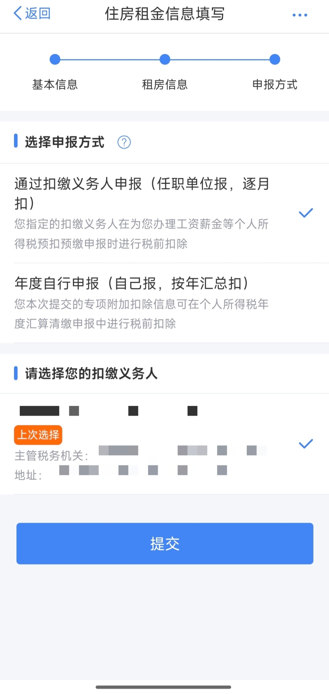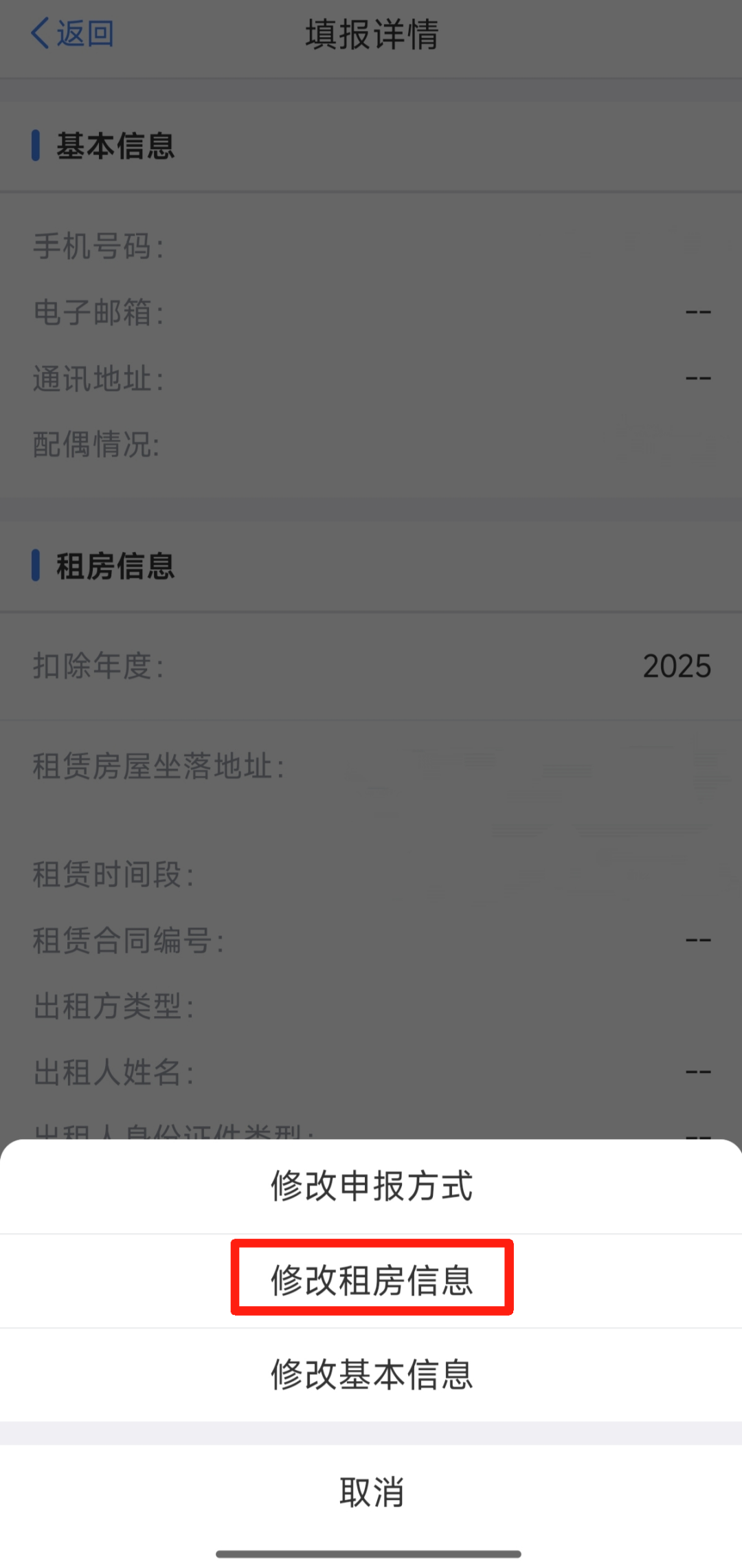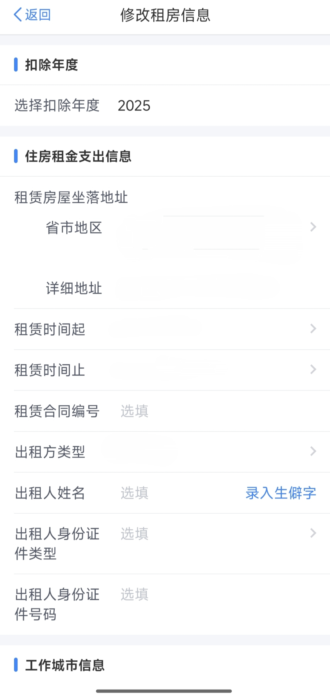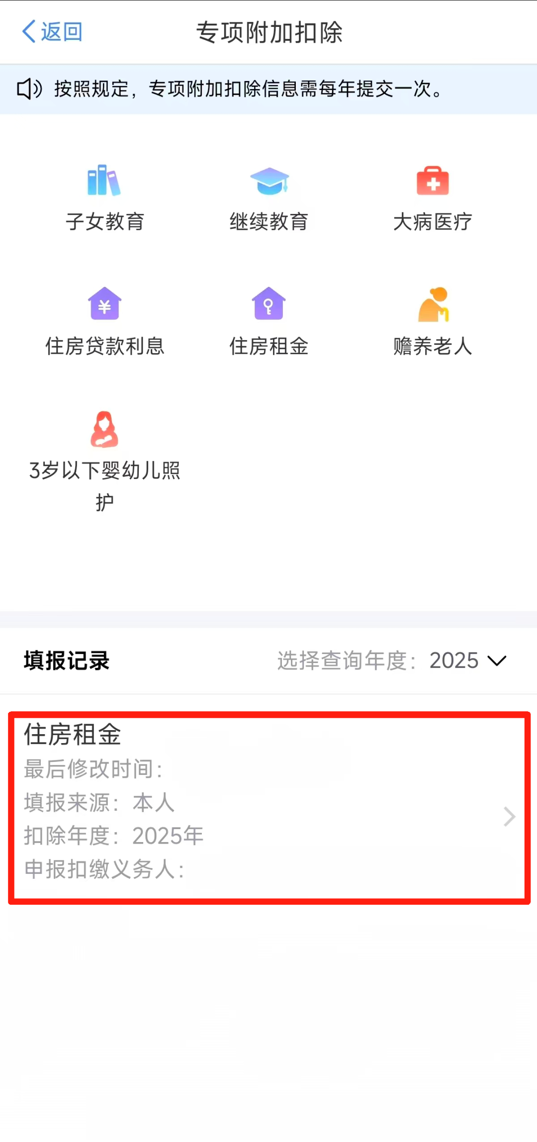 如果之前填写过本年度的住房租金专项附加扣除,先确认此前填报的信息是否正确。如果前一份租赁合同终止或者中止后,签订了新的租赁合同,需要确认之前填报的信息,特别是租赁的起止时间是否正确。