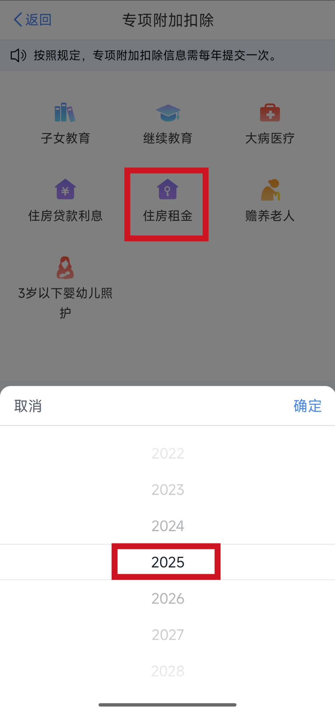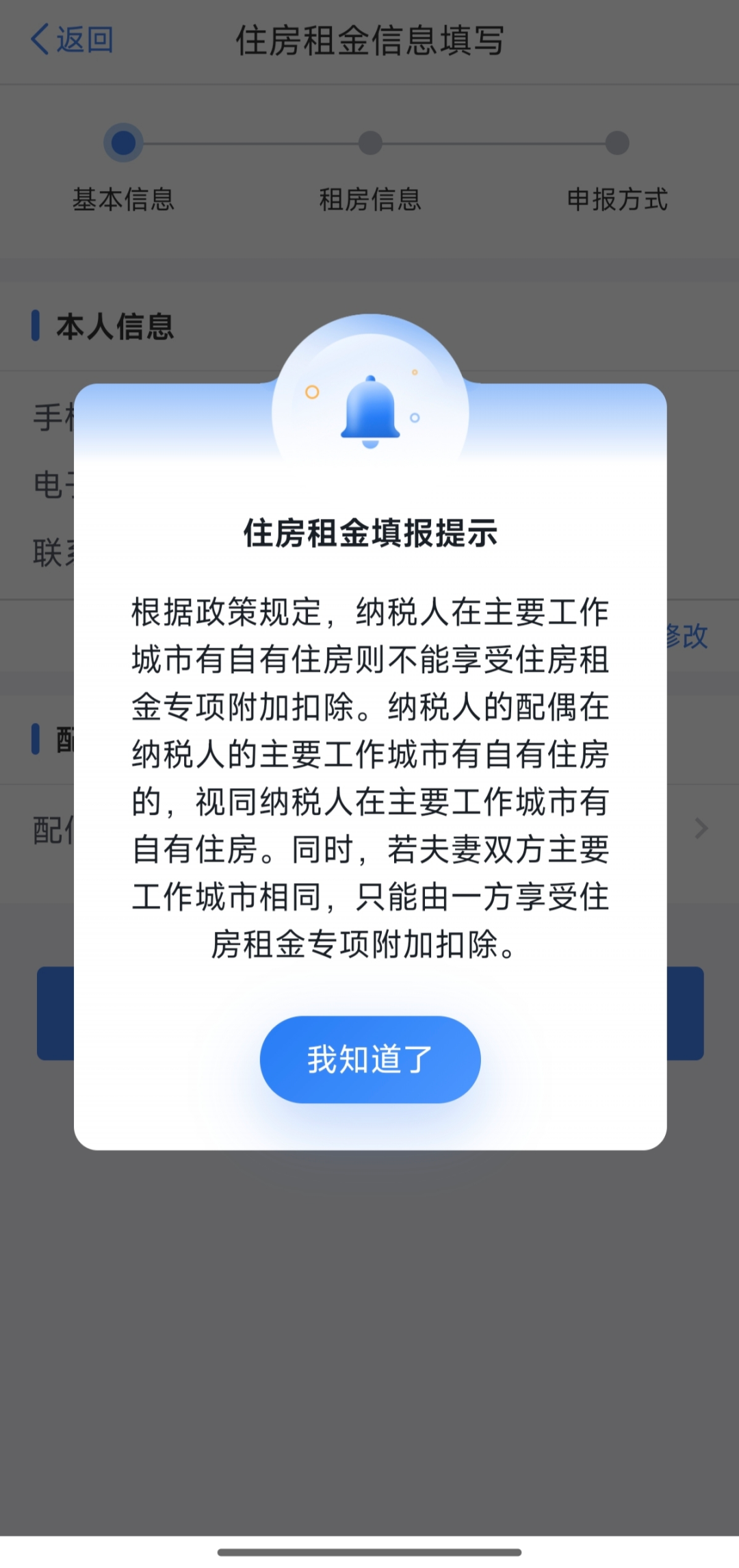 2.点击“住房租金” -选择“扣除年度” -选择配偶情况-阅读温馨提示并点击“我知道了”。