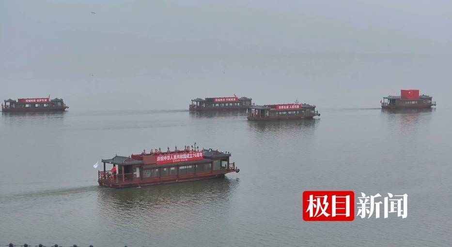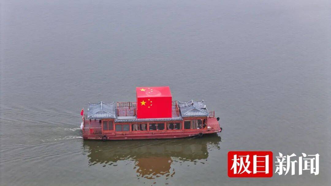 清晨六点半,武汉东湖凌波门栈桥上已聚集了数千名游客。东方天空微微泛红,湖面映出粼粼波光,以一艘载着巨幅国旗的画舫游船为首,身后跟随多艘画舫游船、10艘帆船、8艘智能无人游船、水上超跑游船等组成的水上编队逐光启航。